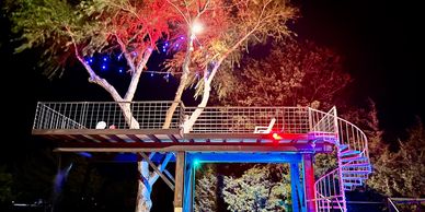 Lakeland RV Ranch offers unique structures and perspectives for a relaxed camping experience like no other. The tree top patio offers a 20' high view of the pond and surrounding terrain. A waterfall all colored lighting creates an ambience for your own private get-away or as many friends who will brave the spiral stairway towards heaven.
